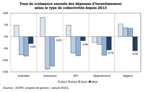 - 25 % de baisse cumulée des investissements de 2014 à 2016, - 35,6 % pour le bloc communal. La diminution concerne à des degrés divers tous les niveaux de collectivités. Au moins 23 milliards d’euros d’investissements sacrifiés sur trois ans, avec d’« importantes conséquences sur la dégradation des infrastructures et des bâtiments, ainsi que sur l’emploi local dans les entreprises de BTP » ;