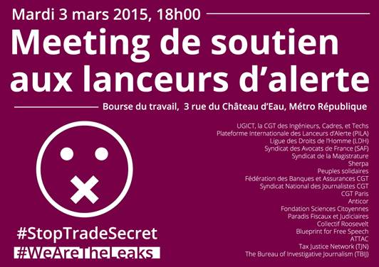 Stéphanie Gibaud secrétaire générale de PILA (Plateforme Internationale des Lanceurs d’Alerte) ; Marie José Kotlicki et Sophie Binet, secrétaires générales de l’UGICT-CGT (Union Générale des Ingénieurs, Cadres et Techniciens CGT) ; Valérie Lefèvre Haussman, secrétaire générale de la fédération des Banques et Assurances CGT ; Emmanuel Vire, secrétaire général du Syndicat National des Journalistes CGT ; Patricia Tejas, secrétaire générale de la fédération des Finances CGT ; Patrick Picard, secrétaire général de la CGT Paris ; Julien Coll, délégué général de Transparency International France ; Bertrand Bocquet, président de la Fondation Sciences Citoyennes ; Françoise Martres, présidente du Syndicat de la Magistrature ; Pierre Tartakowsky, président de la Ligue des droits de l’Homme ; Bernard Pinaud, délégué général du CCFD-Terre Solidaire ; Laetitia Liebert, directrice de Sherpa ; Séverine Tessier, présidente d’Anticor ; Vincent Brossel, directeur de Peuples Solidaires Action Aid ; Benjamin Sonntag, cofondateur de La Quadrature du Net ; Edwy Plenel et Fabrice Arfi, Mediapart ; Chantal Cutajar, présidente de l’OCTFI (Observatoire citoyen pour la transparence financière internationale) ; Fabrice Tarrit, président de Survie ; Jean Louis Marolleau, secrétaire exécutif du réseau foi et Justice Afrique Europe ; Damien Millet, vice président du Cadtm France (Comité de pour l’annulation de la dette du Tiers Monde) ; Denis Vienot, secrétaire général de Justice et Paix ; Vincent Drezet, secrétaire général de Solidaires Finances Publiques ; Bruno Lamour, président du Collectif Roosevelt ; Thomas Coutreau, porte-parole d’Attac France ; Jean Merckaert, rédacteur en chef de la Revue Projet.