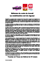 Les fédérations des finances Solidaires, CGT et FO appellent à la grève interprofessionnelle le 31 mars et à participer aux initiatives et actions qui se développeront d’ici cette date pour obtenir le retrait définitif du projet de Loi.