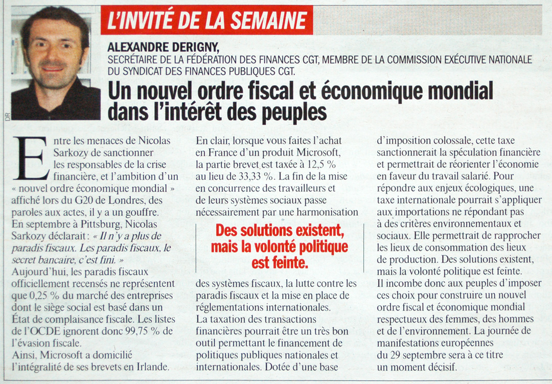 La taxation des transactions financières pourrait être un très bon outil permettant le financement de politiques publiques nationales et internationales. Dotée d’une base d’imposition colossale, cette taxe sanctionnerait la spéculation financière et permettrait de réorienter l’économie en faveur du travail salarié. Pour répondre aux enjeux écologiques, une taxe internationale pourrait s’appliquer aux importations ne répondant pas à des critères environnementaux et sociaux. Elle permettrait de rapprocher les lieux de consommation des lieux de production. Des solutions existent, mais la volonté politique est feinte. Il incombe donc aux peuples d’imposer ces choix pour construire un nouvel ordre fiscal et économique mondial respectueux des femmes, des hommes et de l’environnement. La journée de manifestations européennes du 29 septembre sera à ce titre un moment décisif.