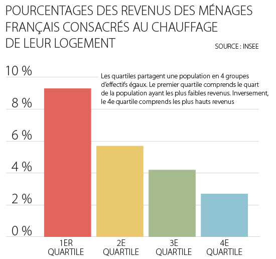 Quarante pays disposent aujourd’hui d’une taxe ou d’un marché du carbone. Donner un prix au carbone a pour objectif de réorienter peu à peu les actuels soutiens financiers et fiscaux aux énergies fossiles pour les diriger vers les énergies renouvelables. Mais cela soulève aussi de vives oppositions. En ciblant les produits énergétiques (gaz, fioul, pétrole, charbon,...), cette taxe pèse sur les budgets des ménages déjà en situation de précarité énergétique du fait de leur logement (hausse du prix du chauffage)ou de l’éloignement entre leur domicile et leur travail (hausse du prix du carburant). Et cette taxe sera multipliée par 4 d’ici 2022 et par 7 d’ici 2030. Le coût de l’énergie touche particulièrement les ménages les plus précaires (voir graphique ci-contre).