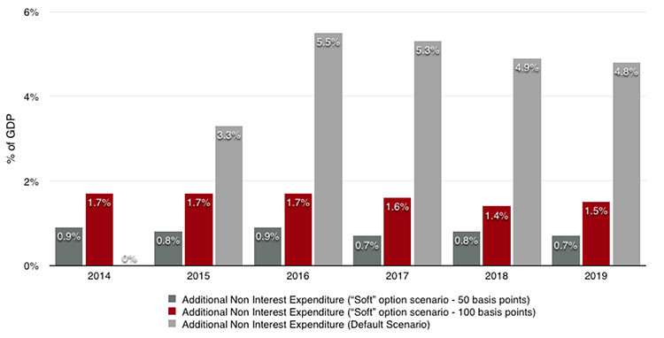 4 – L’option « dure » dégagerait une marge de manœuvre budgétaire substantielle qui représenterait en moyenne 4,8 % du PIB sur la période 2014-2019. Cela correspond pratiquement à 10 milliards d’euros par an qui seraient disponibles pour l’investissement public, les augmentations de salaires et de pensions et les dépenses sociales. Ce gain serait entre six et trois fois et demie supérieur à celui de l’option « douce », suivant la baisse du taux d’intérêt retenue. Sur l’ensemble de la période, c’est une somme énorme pour l’économie en dépression de la Grèce.