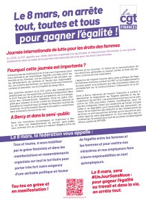 Cette journée de mobilisation du 8 mars est importante pour nous permettre de revendiquer l’égalité concrète entre les femmes et les hommes, sur les salaires et les retraites, sur les déroulements de carrières et l’accès aux responsabilités, sur la santé des femmes, sur la lutte contre les violences sexistes et sexuelles, sur la conquête du temps libre.